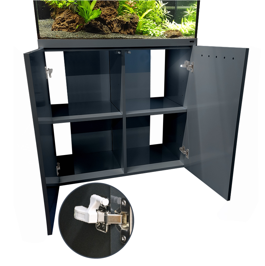 Der Aquarienunterschrank wird als Bausatz komplett mit Aufbauzubehör geliefert. Die beschichteten Spanplatten werden in Hochglanz weiß oder grau geliefert und sind farblich identisch mit der Abdeckleuchte. Alle Bauteile inclusive der Türen und Ablagebretter werden in 19 mm Stärke extrastabil gefertigt. Die Türen sind mit professionellen Scharnieren aus dem gehobenen Küchenbau mit Push & Pull Öffnung ausgestattet. Die Schränke sind für jede Tür mit Drucksensoren und Beleuchtung zur vollständigen Ausleuchtung des Schrankinneren ausgestattet. In den Seitenfächern können die beigelegten Einlegeböden höhenverstellbar angebracht werden. Der Einlegeboden in der Mitte ist bei den Modellen Alux 330 und 450 fest verbaut. Die Rückwand besteht aus stabilen 19 mm starken Brettern in Schrankfarbe und bieten Platz für den bequemen Einbau incl. Verrohrung aller gängigen Aussenfilter etc.