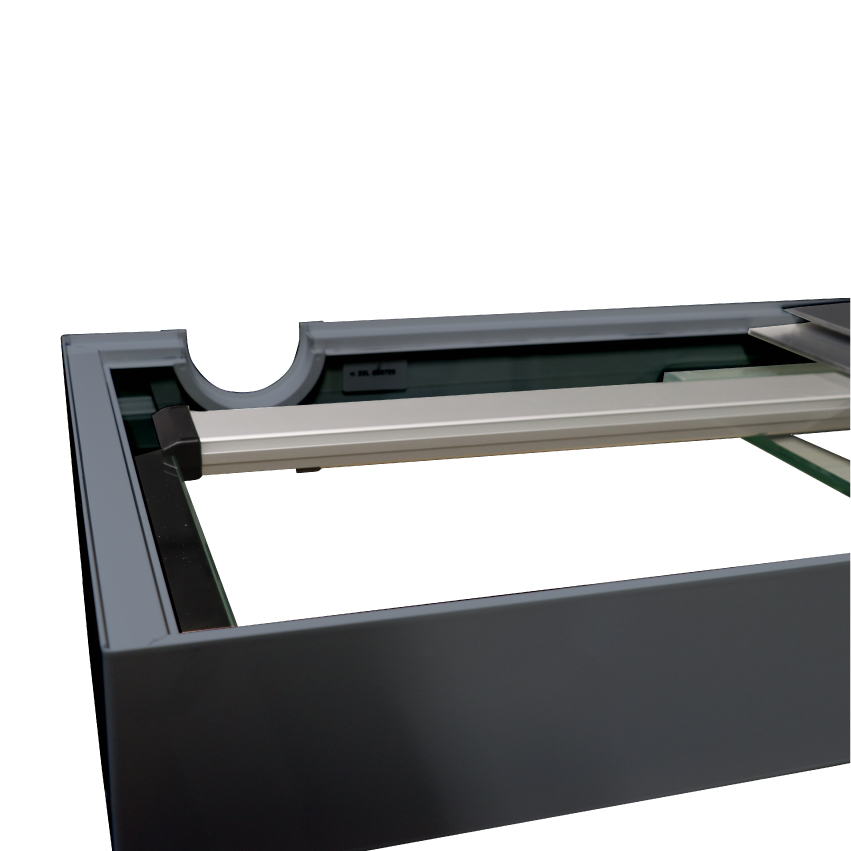 Der Rahmen der Aquarienabdeckung besteht aus eloxiertem und hochglanzlackiertem Aluminium. Er ist aus einem Stück gefertigt, das bedeutet eine besondere Stabilität und Ästhetik. Der Rahmen ist rundum auf das Aquarium aufgeklebt, so dass an keiner Stelle Wasser an der Abdeckung heruntertropfen kann. Das gleiche gilt für die Deckel, die in Form von 2 Schiebeplatten äußerst praktisch in für sie im Rahmen gefertigte Schienen aufliegen. Die Deckel sind aus gebürstetem DIBOND-Aluminium gefertigt. Das wertet die amtra Alux Aquarienkombinationen noch mehr auf und gibt ihnen eine ganz besondere Note. Im Deckel enthalten ist eine praktische verschließbare Öffnung für eine schnelle Fütterung oder der Installation eines Futterautomaten. Auf der Rückseite befinden sich auf beide Seiten Durchgänge für Schläuche und Elektrokabel. Jeder Durchgang kann ohne Probleme je 2 16/22mm Schläuche bzw. Rohre des gleichen Durchmessers plus Kabel ohne Platzprobleme aufnehmen und sorgt so für eine stressfreie Installation aller gängigen Aquarienaussenfilter auf dem Markt.