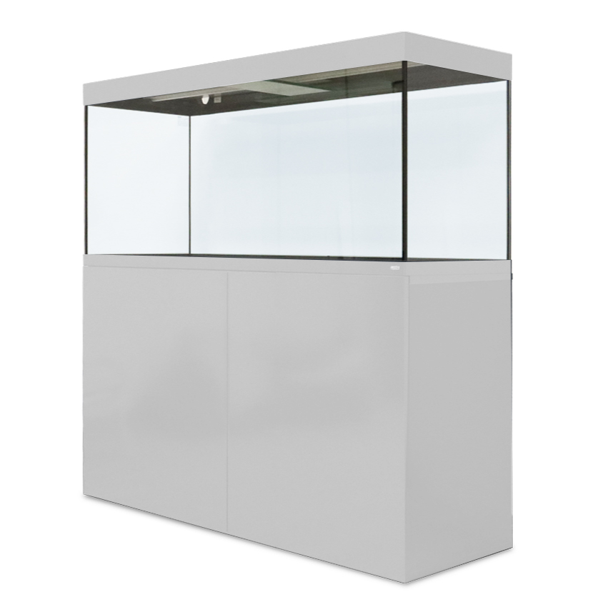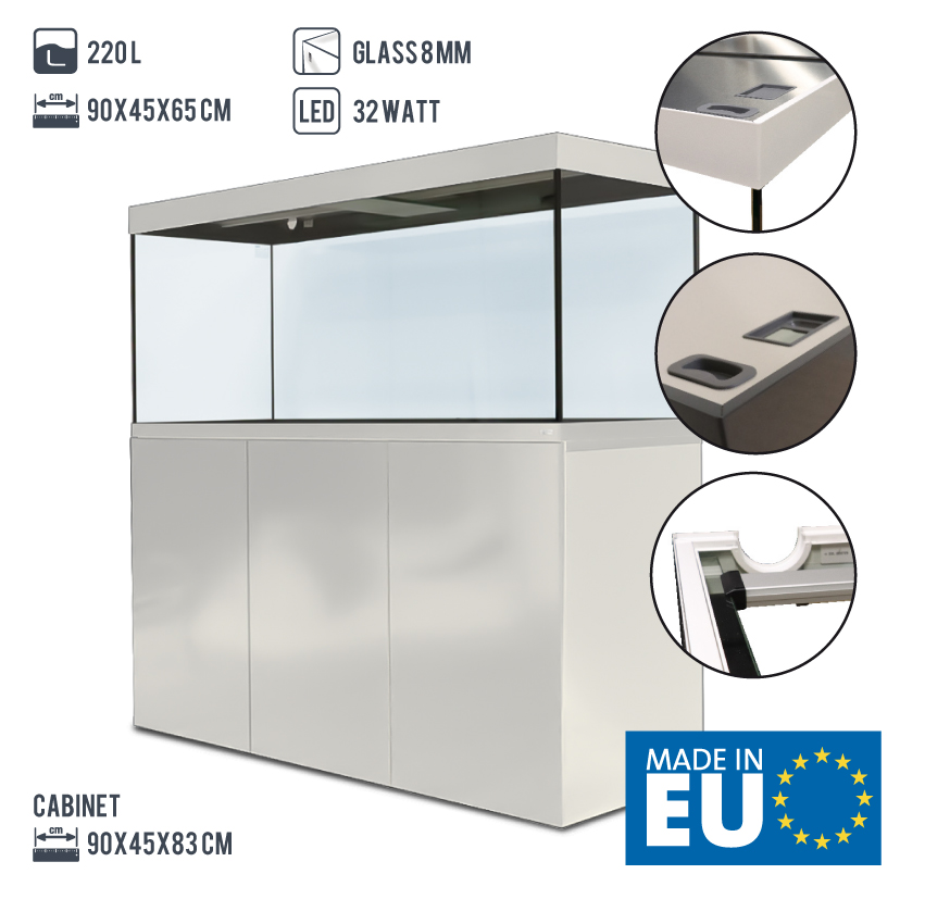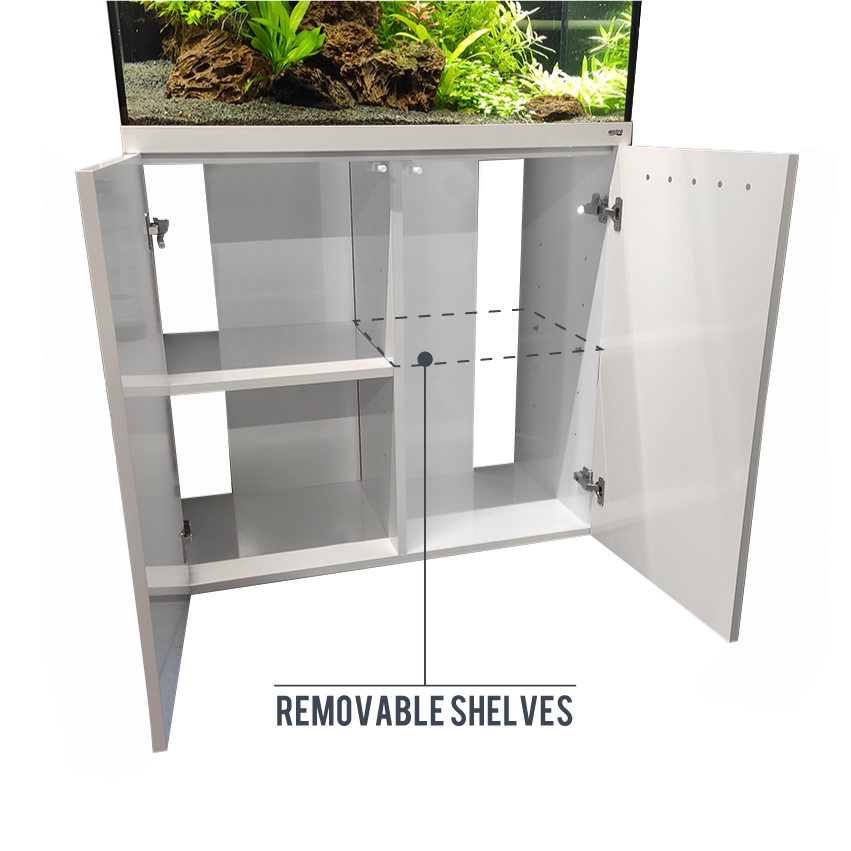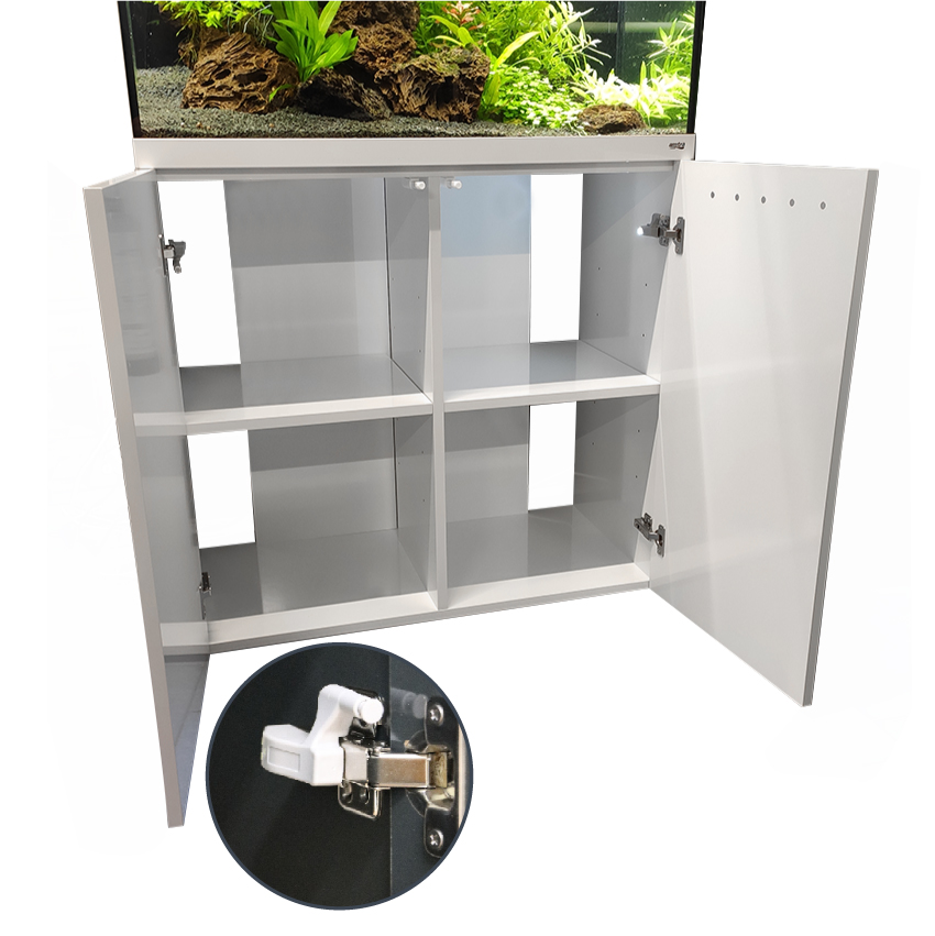 Der Aquarienunterschrank wird als Bausatz komplett mit Aufbauzubehör geliefert. Die beschichteten Spanplatten werden in Hochglanz weiß oder grau geliefert und sind farblich identisch mit der Abdeckleuchte. Alle Bauteile inclusive der Türen und Ablagebretter werden in 19 mm Stärke extrastabil gefertigt. Die Türen sind mit professionellen Scharnieren aus dem gehobenen Küchenbau mit Push & Pull Öffnung ausgestattet. Die Schränke sind für jede Tür mit Drucksensoren und Beleuchtung zur vollständigen Ausleuchtung des Schrankinneren ausgestattet. In den Seitenfächern können die beigelegten Einlegeböden höhenverstellbar angebracht werden. Der Einlegeboden in der Mitte ist bei den Modellen Alux 330 und 450 fest verbaut. Die Rückwand besteht aus stabilen 19 mm starken Brettern in Schrankfarbe und bieten Platz für den bequemen Einbau incl. Verrohrung aller gängigen Aussenfilter etc.