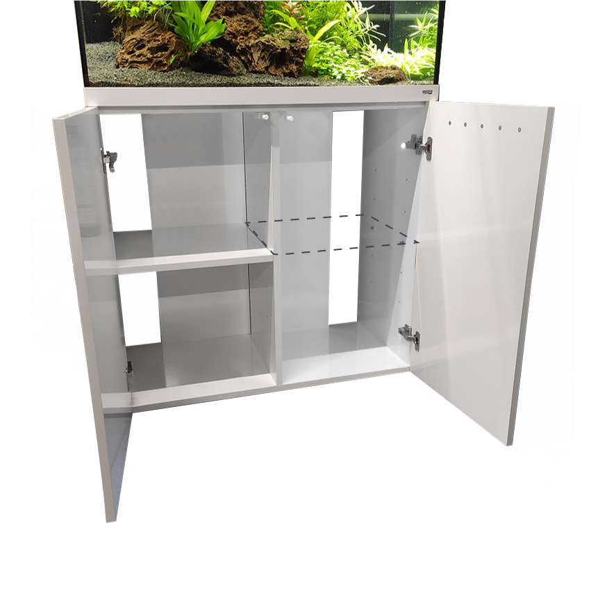 Der Aquarienunterschrank wird als Bausatz komplett mit Aufbauzubehör geliefert. Die beschichteten Spanplatten werden in Hochglanz weiß oder grau geliefert und sind farblich identisch mit der Abdeckleuchte. Alle Bauteile inclusive der Türen und Ablagebretter werden in 19 mm Stärke extrastabil gefertigt. Die Türen sind mit professionellen Scharnieren aus dem gehobenen Küchenbau mit Push & Pull Öffnung ausgestattet. Die Schränke sind für jede Tür mit Drucksensoren und Beleuchtung zur vollständigen Ausleuchtung des Schrankinneren ausgestattet. In den Seitenfächern können die beigelegten Einlegeböden höhenverstellbar angebracht werden. Der Einlegeboden in der Mitte ist bei den Modellen Alux 330 und 450 fest verbaut. Die Rückwand besteht aus stabilen 19 mm starken Brettern in Schrankfarbe und bieten Platz für den bequemen Einbau incl. Verrohrung aller gängigen Aussenfilter etc.