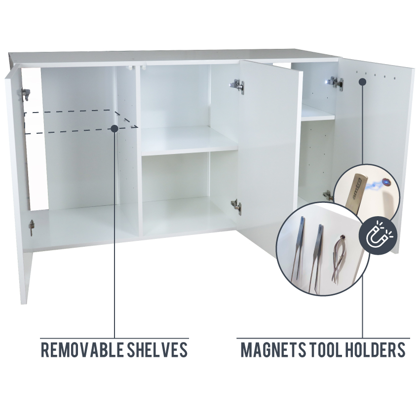 Das besondere an den Alux Schränken ist ihre außergewöhnliche Höhe von 83 cm. Dadurch passen selbst die großen Aussenfilter wie z.B. der Eheim 2080 oder Oase BioMaster 850 bequem in den Unterschrank und die Schläuche lassen sich knickfrei und anwenderfreundlich verlegen. In der rechten Tür sind 5 kräftige Magnete eingelassen, die Aquarien Aquascaping Besteck aus Edelstahl sauber aufnehmen.
