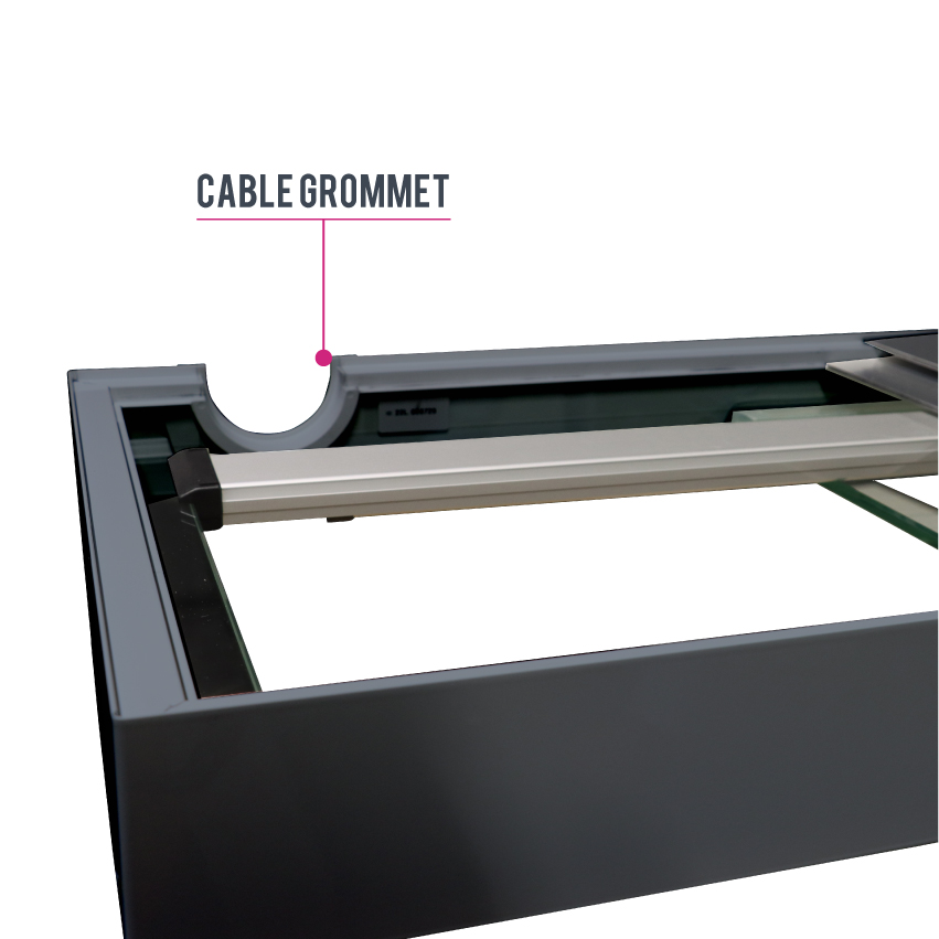 Die Aquarien werden von einer 40 mm hohen aus einem Stück bestehenden Kiesblende aus eloxiertem und lackierten Aluminium elegant umschlossen. Dadurch kann bei der Aufstellung des Aquariums auf eine Unterlegmatte verzichtet werden.