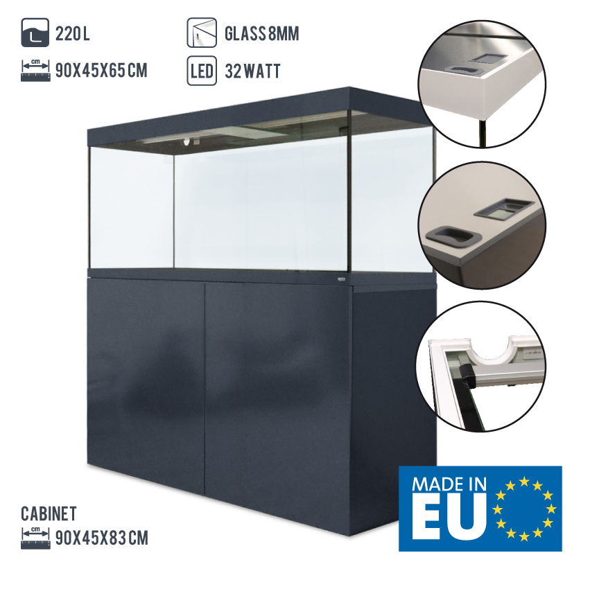 Der Aquarienunterschrank wird als Bausatz komplett mit Aufbauzubehör geliefert. Die beschichteten Spanplatten werden in Hochglanz weiß oder grau geliefert und sind farblich identisch mit der Abdeckleuchte. Alle Bauteile inclusive der Türen und Ablagebretter werden in 19 mm Stärke extrastabil gefertigt. Die Türen sind mit professionellen Scharnieren aus dem gehobenen Küchenbau mit Push & Pull Öffnung ausgestattet. Die Schränke sind für jede Tür mit Drucksensoren und Beleuchtung zur vollständigen Ausleuchtung des Schrankinneren ausgestattet. In den Seitenfächern können die beigelegten Einlegeböden höhenverstellbar angebracht werden. Der Einlegeboden in der Mitte ist bei den Modellen Alux 330 und 450 fest verbaut. Die Rückwand besteht aus stabilen 19 mm starken Brettern in Schrankfarbe und bieten Platz für den bequemen Einbau incl. Verrohrung aller gängigen Aussenfilter etc.