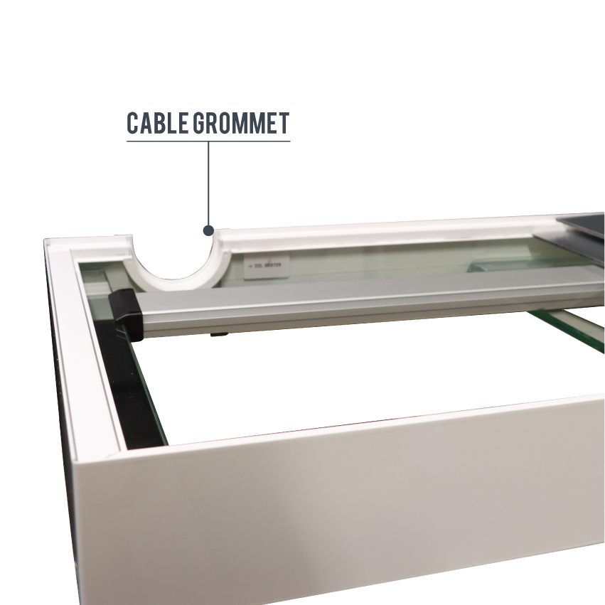 Die Aquarien werden von einer 40 mm hohen aus einem Stück bestehenden Kiesblende aus eloxiertem und lackierten Aluminium elegant umschlossen. Dadurch kann bei der Aufstellung des Aquariums auf eine Unterlegmatte verzichtet werden.