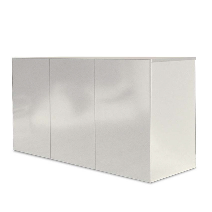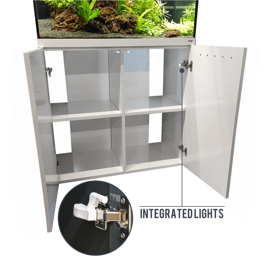Der Aquarienunterschrank wird als Bausatz komplett mit Aufbauzubehör geliefert. Die beschichteten Spanplatten werden in Hochglanz weiß oder grau geliefert und sind farblich identisch mit der Abdeckleuchte. Alle Bauteile inclusive der Türen und Ablagebretter werden in 19 mm Stärke extrastabil gefertigt. Die Türen sind mit professionellen Scharnieren aus dem gehobenen Küchenbau mit Push & Pull Öffnung ausgestattet. Die Schränke sind für jede Tür mit Drucksensoren und Beleuchtung zur vollständigen Ausleuchtung des Schrankinneren ausgestattet. In den Seitenfächern können die beigelegten Einlegeböden höhenverstellbar angebracht werden. Der Einlegeboden in der Mitte ist bei den Modellen Alux 330 und 450 fest verbaut. Die Rückwand besteht aus stabilen 19 mm starken Brettern in Schrankfarbe und bieten Platz für den bequemen Einbau incl. Verrohrung aller gängigen Aussenfilter etc.
