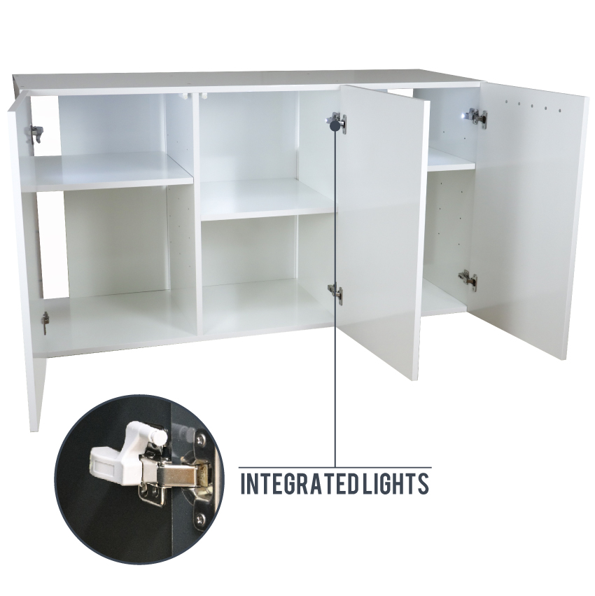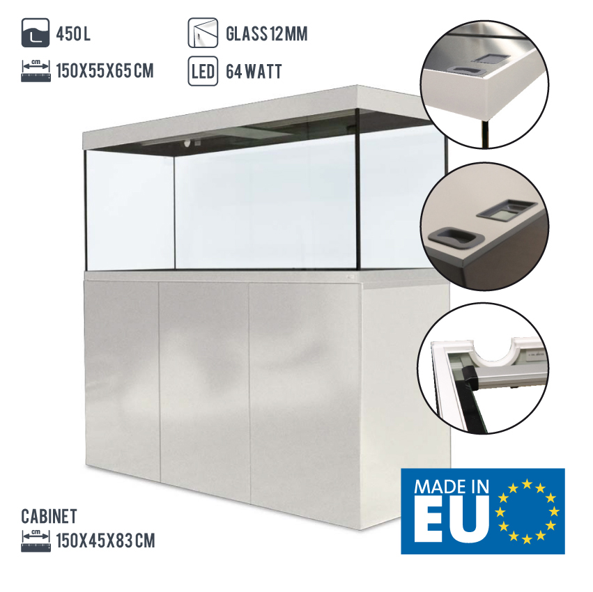 Der Aquarienunterschrank wird als Bausatz komplett mit Aufbauzubehör geliefert. Die beschichteten Spanplatten werden in Hochglanz weiß oder grau geliefert und sind farblich identisch mit der Abdeckleuchte. Alle Bauteile inclusive der Türen und Ablagebretter werden in 19 mm Stärke extrastabil gefertigt. Die Türen sind mit professionellen Scharnieren aus dem gehobenen Küchenbau mit Push & Pull Öffnung ausgestattet. Die Schränke sind für jede Tür mit Drucksensoren und Beleuchtung zur vollständigen Ausleuchtung des Schrankinneren ausgestattet. In den Seitenfächern können die beigelegten Einlegeböden höhenverstellbar angebracht werden. Der Einlegeboden in der Mitte ist bei den Modellen Alux 330 und 450 fest verbaut. Die Rückwand besteht aus stabilen 19 mm starken Brettern in Schrankfarbe und bieten Platz für den bequemen Einbau incl. Verrohrung aller gängigen Aussenfilter etc.